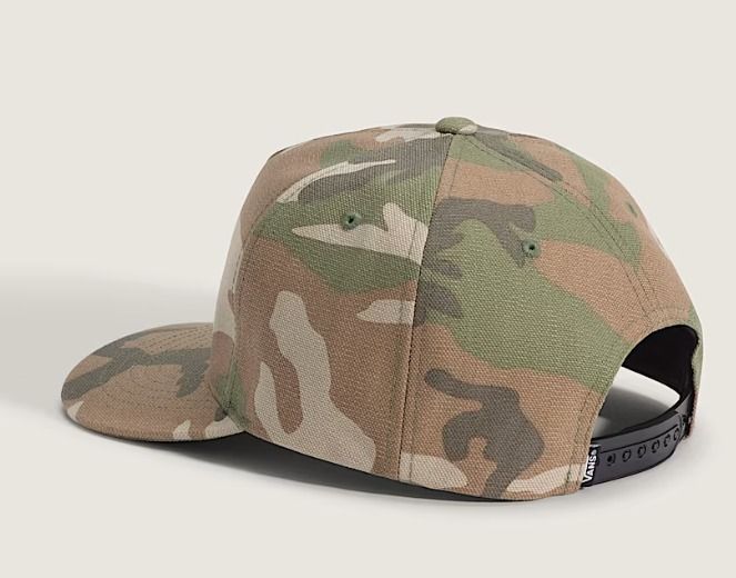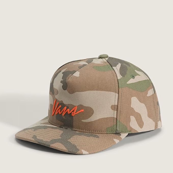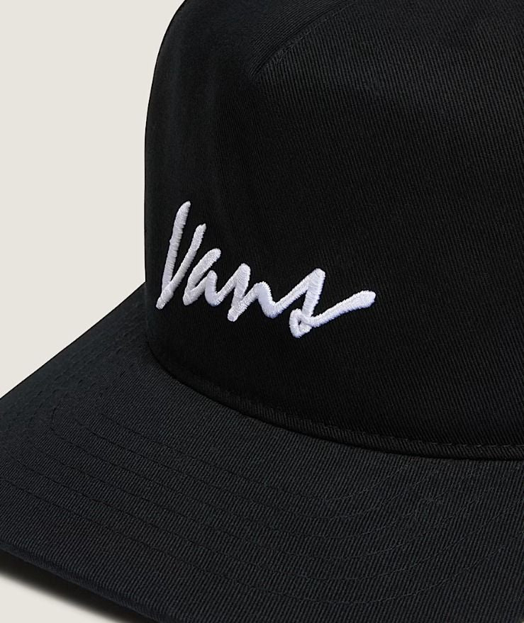 Casquette Snapback à script classique Forme à 5 panneaux avec structure moyenne La visière légèrement incurvée épouse la forme du visage pour une coupe classique Bouton-pression réglable pour un ajustement personnalisé Broderie directe sur le panneau avant Étiquette drapeau Vans sur la fermeture à pression arrière 100% coton