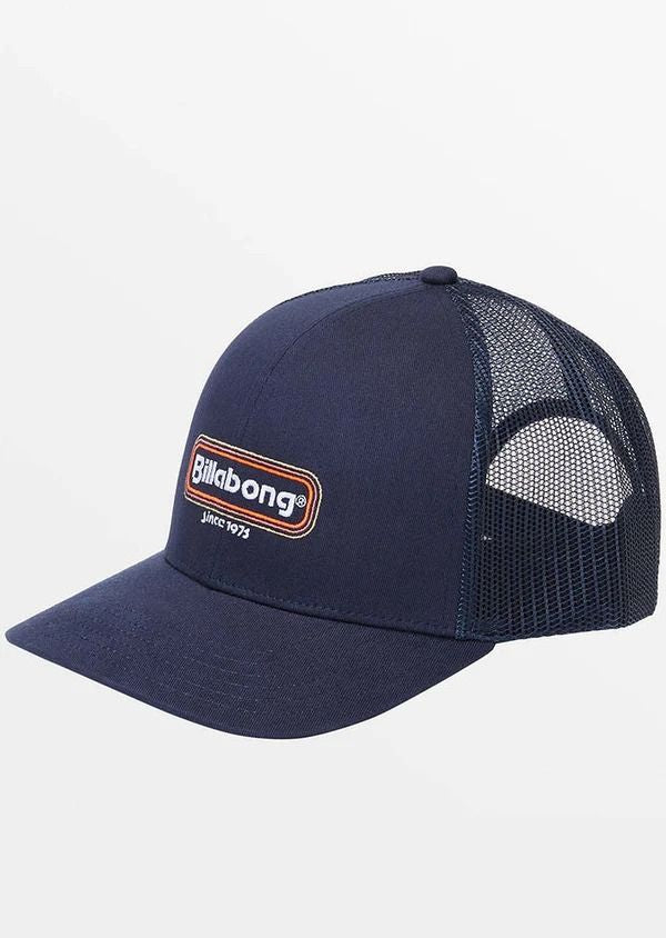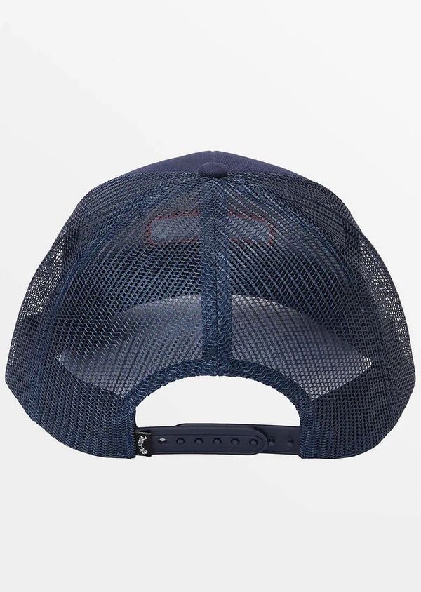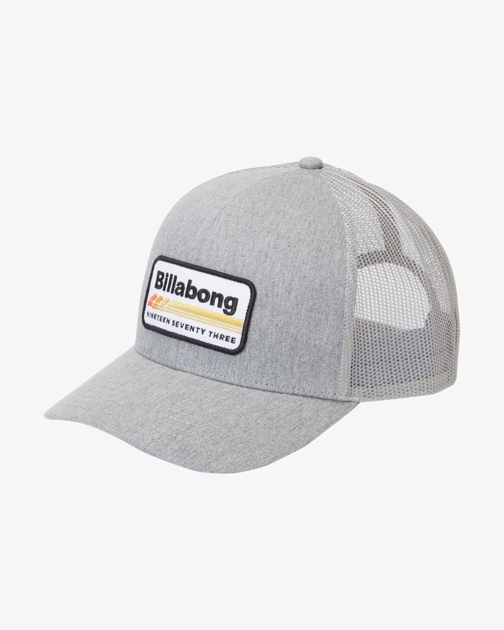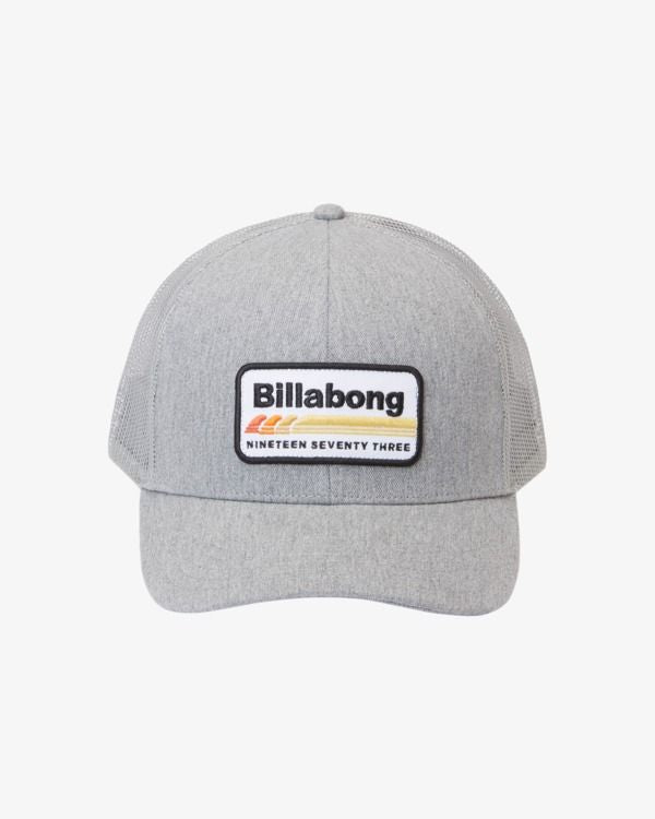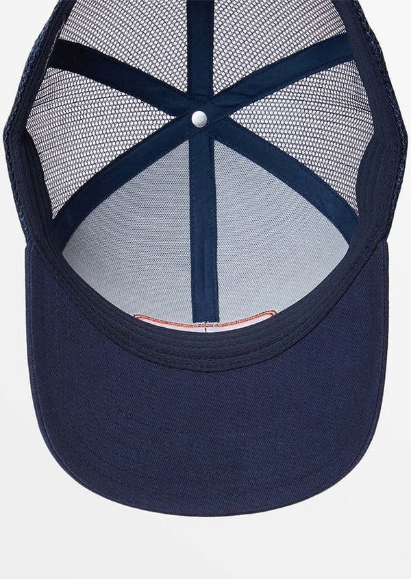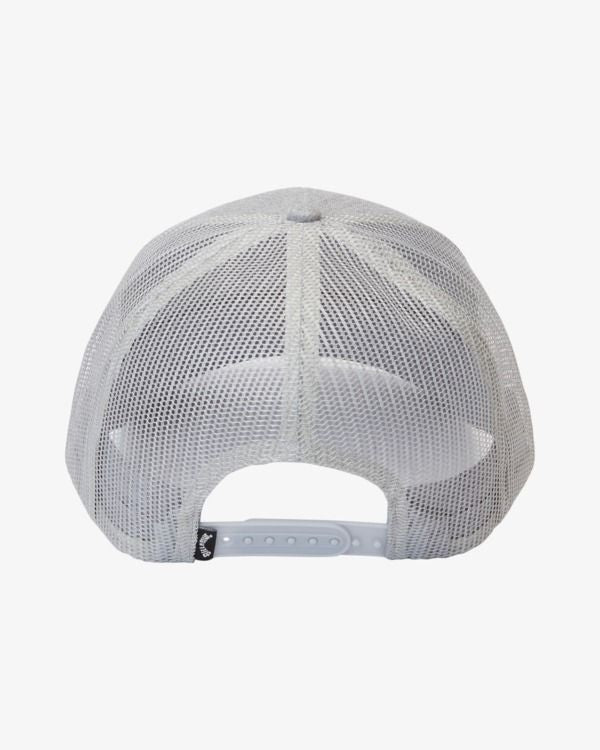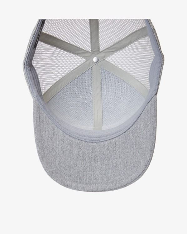 Sergé de coton avec empiècement arrière en maille polyester 6 panneaux, profil haut avec structure rigide Courbée Fermeture réglable à bouton-pression en plastique (snapback) Étiquette drapeau arquée près de la fermeture Patch en sergé gris chiné et crème avec bord merrowed Étiquette tissée noire avec motif à bord merrowed au centre de la couronne avant 57 % polyester, 43 % coton