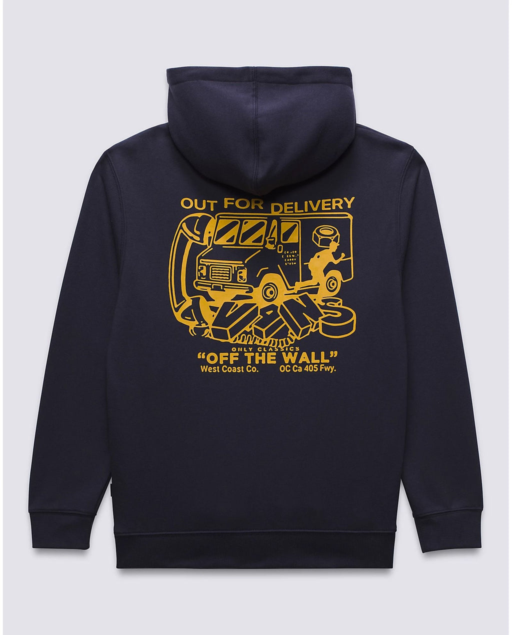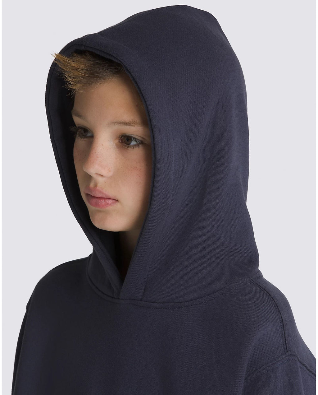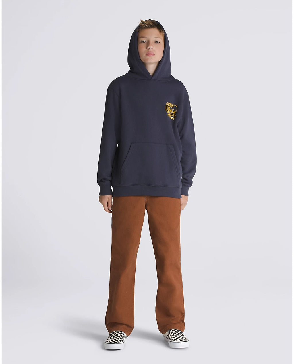 Le hoodie à capuche Kids Next Stop Pullover est un hoodie classique fabriqué en fleece brossé doux. Il présente une poche kangourou, des détails côtelés et un graphique sérigraphié du logo Vans® sur le devant, avec une scène de camion de livraison au dos.