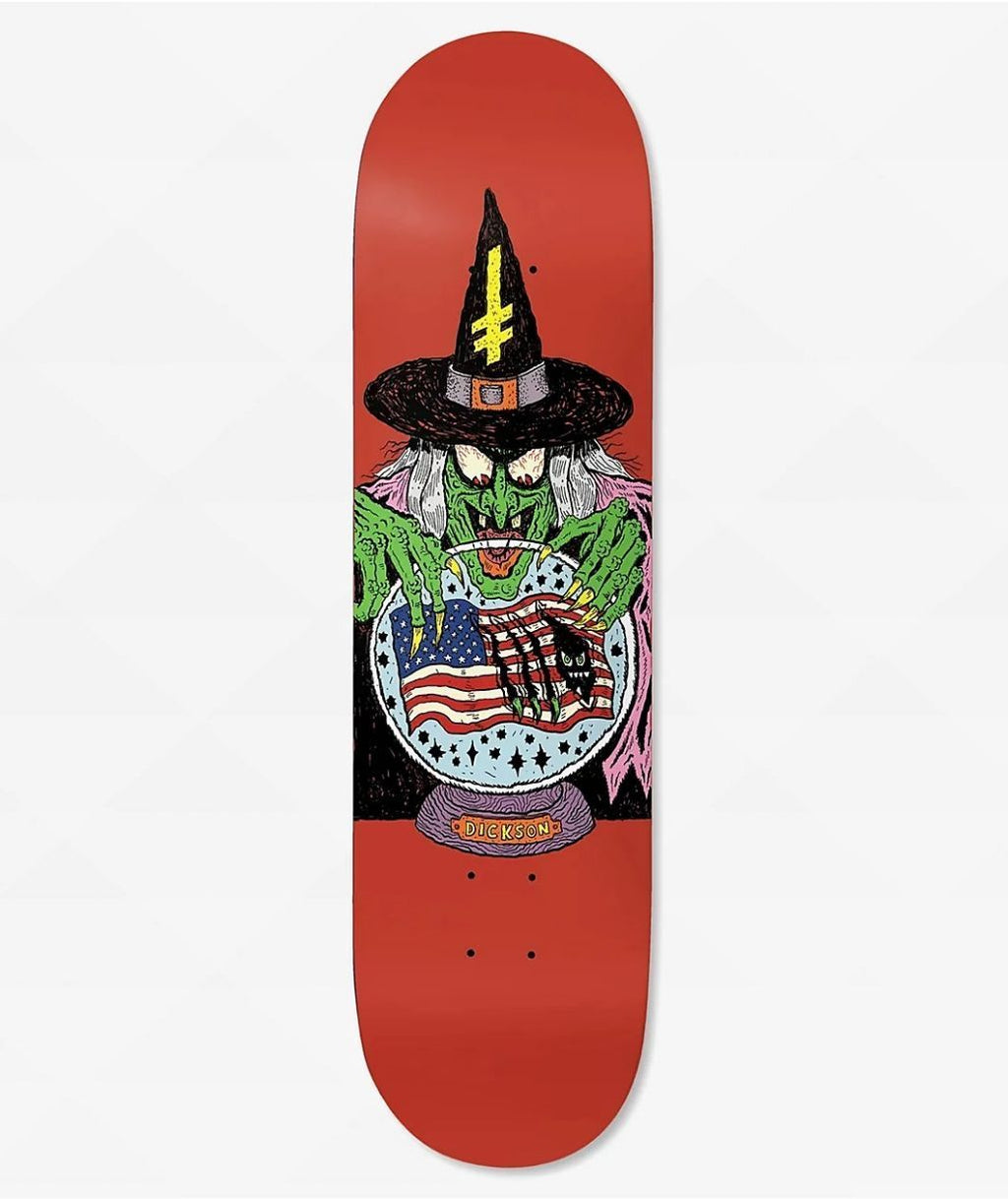 Les esprits de Deathwish accueillent la planche de skateboard signature Jon Dickson Deathwitch Trials 8.0. Entièrement trempée dans la peinture et fabriquée avec sept couches de bois d'érable canadien Hard Rock, l'imagerie sur la couche inférieure montre une sorcière verte regardant dans une boule de cristal où elle voit un drapeau américain orné de la marque et du nom de famille des coureurs de l'équipe.