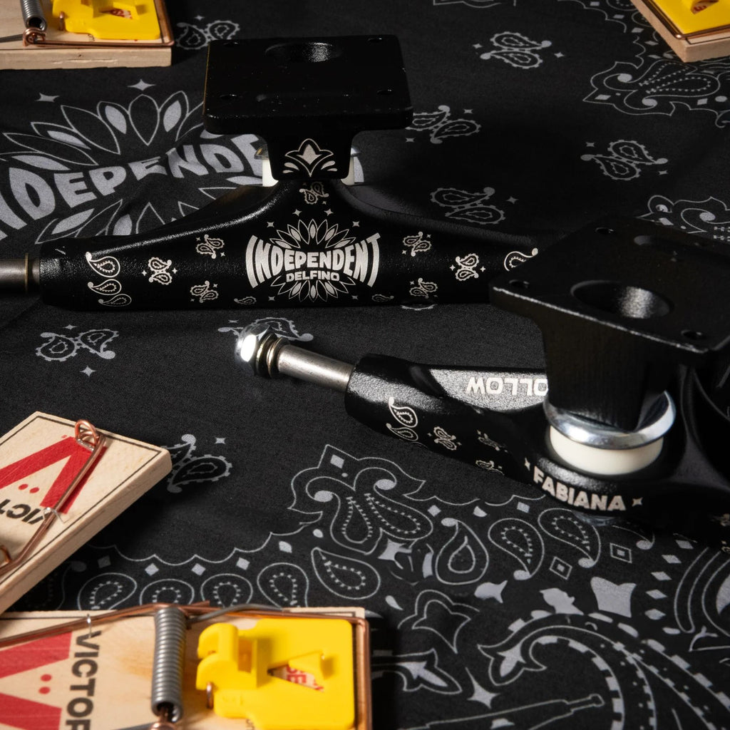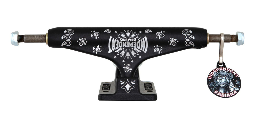 Trucks Independent Fabiana Defino Pro Stage 11 Hollow avec finition noire poudrée à texture fine, motif bandana gravé au laser sur le cintre et l'embase, coussins blancs, quincaillerie argentée et étiquette porte-clés style pin's punk personnalisée.