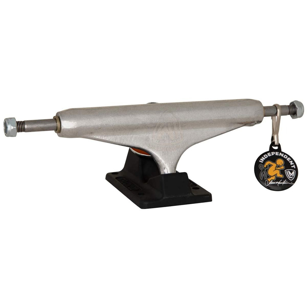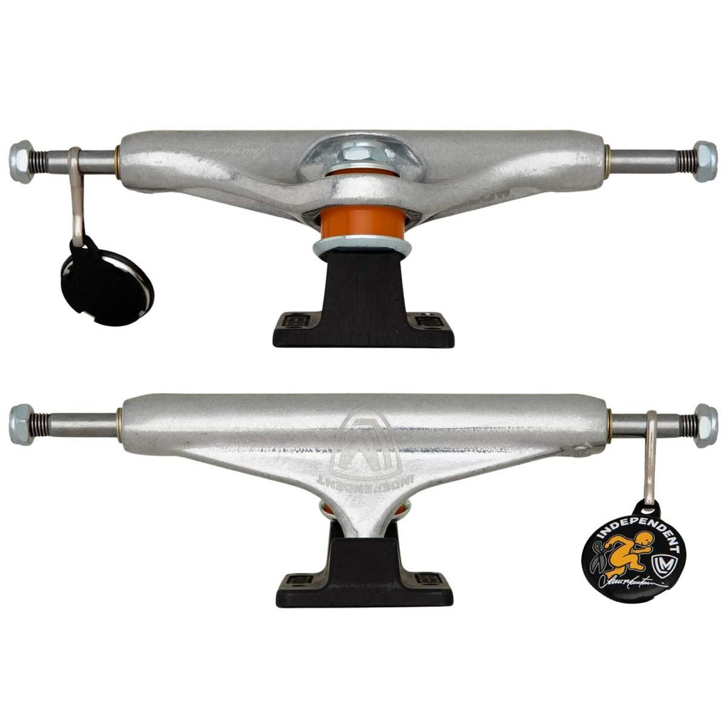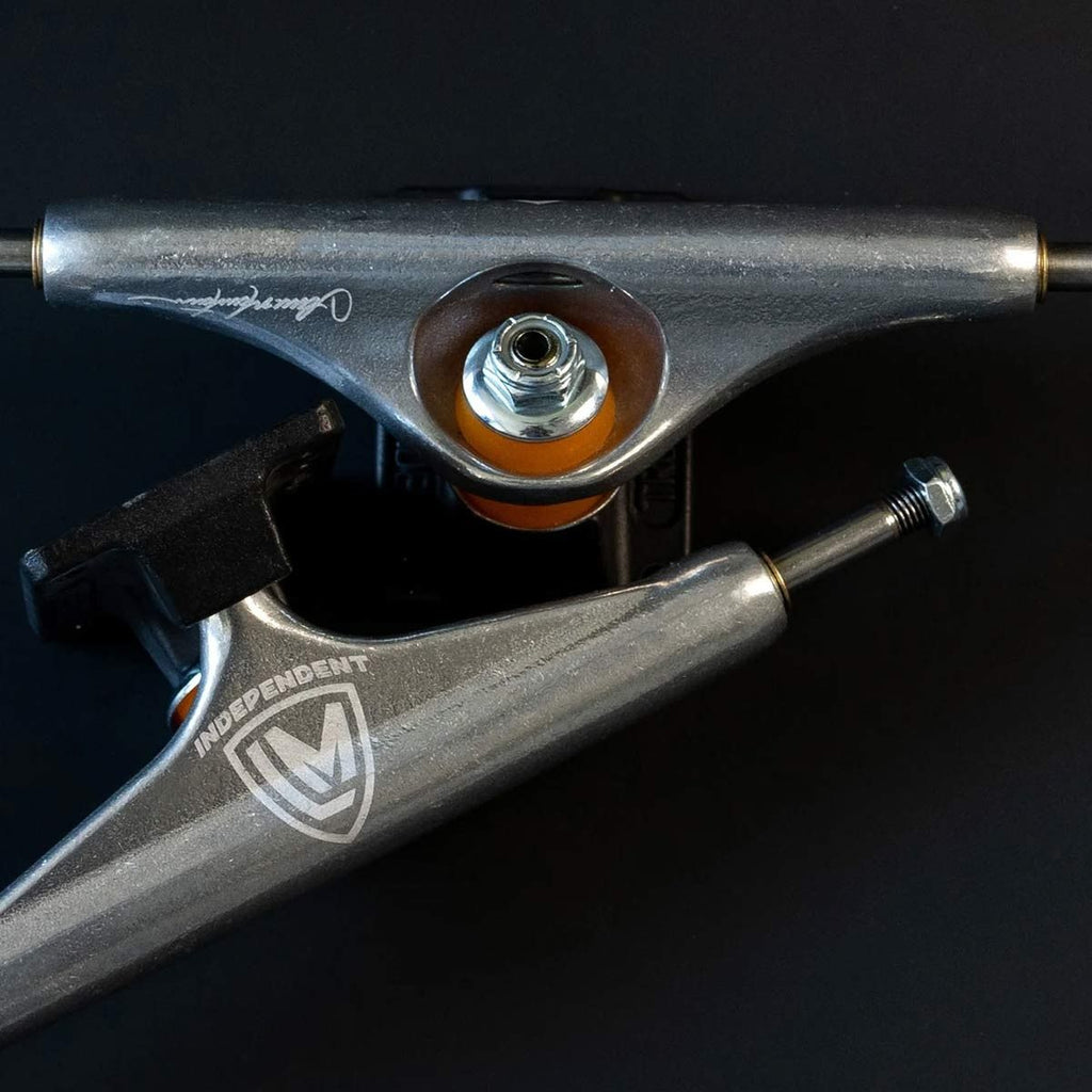 Hanger argent poli avec logos Indy LM et signature gravés au laser, baseplate noire anodisée, bushings orange classiques Indy, visserie argentée, et un porte-clé punk pin à l’effigie de Lance Mountain inclus.
