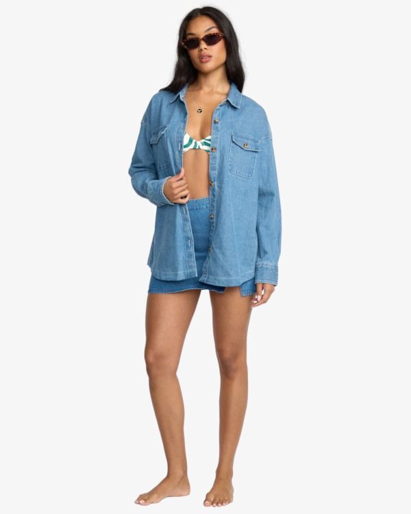 Coton denim Oversize Poches plaquées à l'avant Manches longues Modèle boutonné Étiquette tissée cousue 100% Coton