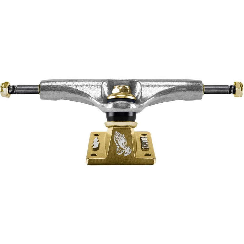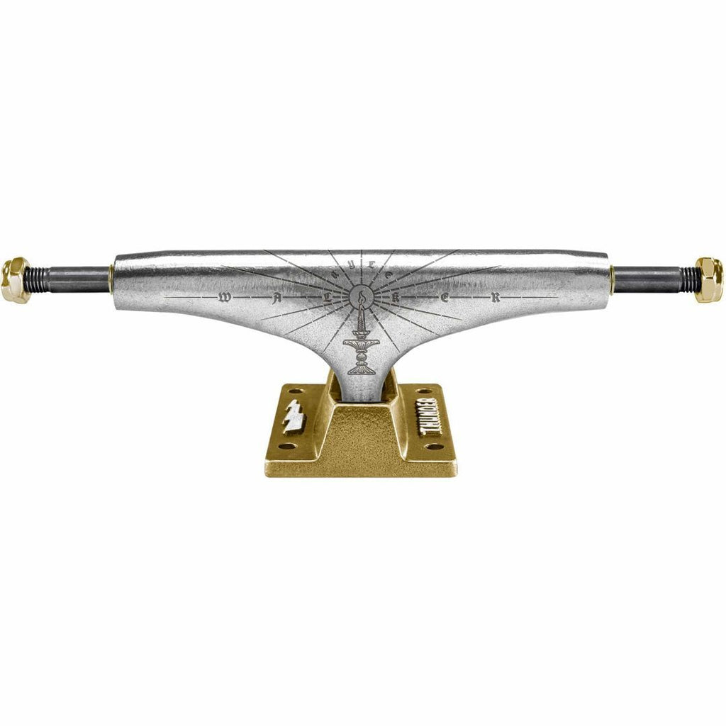 Trucks Kyle Walker Pro Edition « Luminary » Thunder. Légers et ultra-réactifs. Hangers polis avec embases Team Edition dorées. Graphisme gravé au laser à l'arrière. Bushings Thunder noirs opaques 90A. Écrous et rondelles dorés. Axe standard, kingpin standard, embase Team. Longueur d'axe : 148 mm (8,25 pouces). Vendu à l'unité