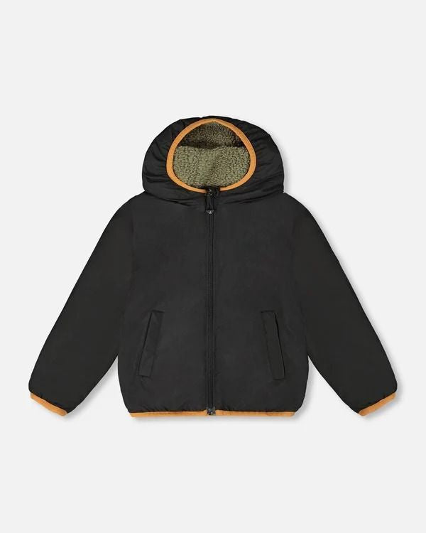 Réversible d’un tissu oxford enduit de polyuréthane à une douce matière sherpa, cette veste de mi-saison offre une double dose de polyvalence. Dotée d’une fermeture éclair frontale, de poches des deux côtés et d’un capuchon attaché, son côté uni est déperlant et imperméable, idéal pour les journées fraîches et humides. Composition: 100% Polyester Imperméabilité : Tissu (côté tissé) enduit d'un revêtement de Polyuréthane 600 mm qui permet de garder votre enfant au sec lors de petites intempéries. Sans fluorocarbone : Le tissu (côté tissé) est traité à l’extérieur avec un protecteur durable et écologique déperlant à l'eau et à la saleté BIONIC-FINISH®ECO. Ce protecteur ne contient aucun PFAS, PFOS, PFOA. Manteau éco-responsable: côté sherpa, fait de polyester recyclé certifié OEKO-TEX® ???? Robustesse : Fermoir principal de qualité supérieure YKK® robuste Veste réversible Capuchon réversible Poche munie d'un fermoir à zip du côté sherpa et 2 poches à fermetures à Velcro du côté nylon