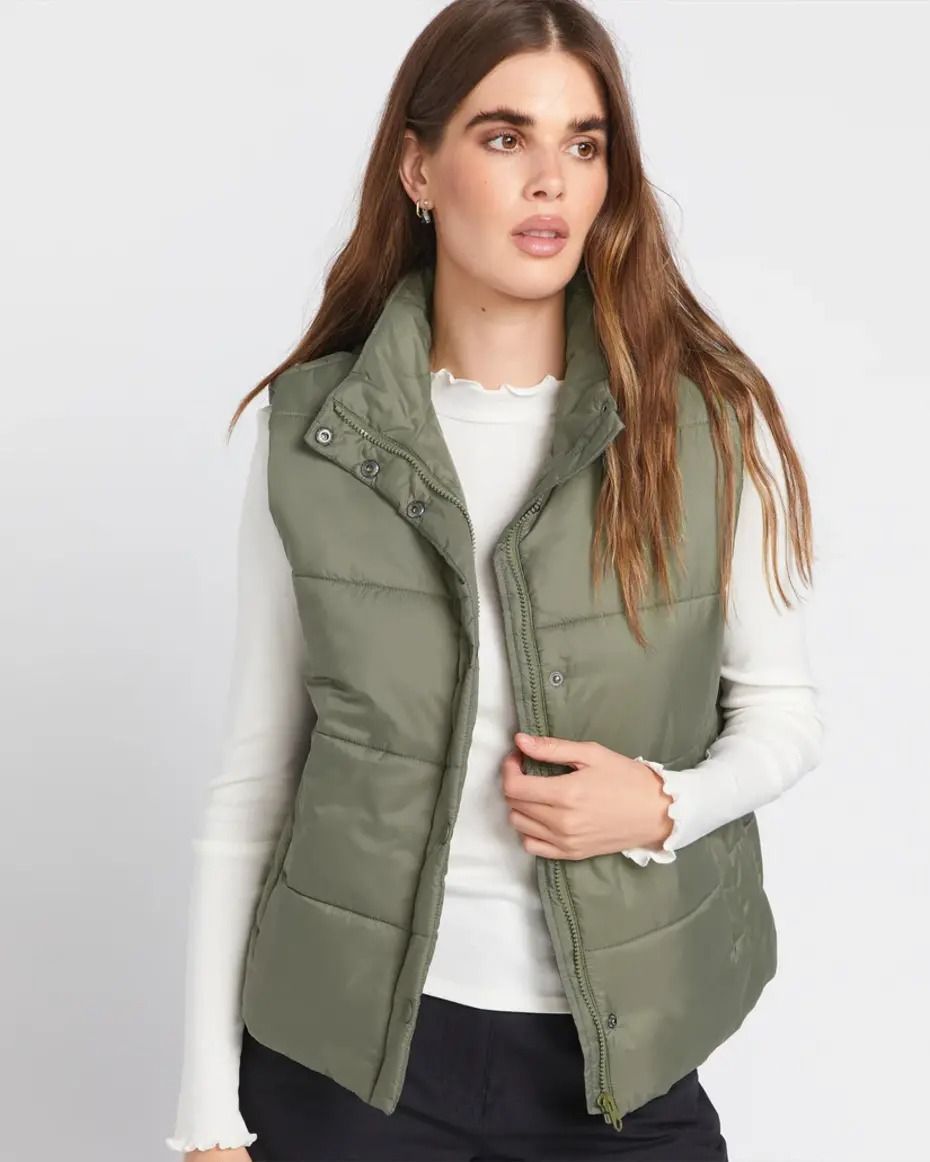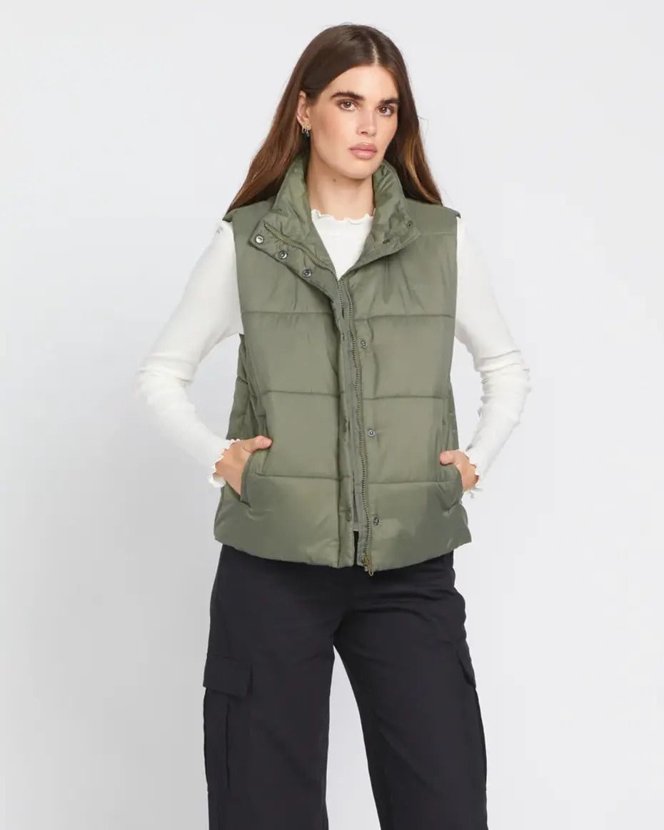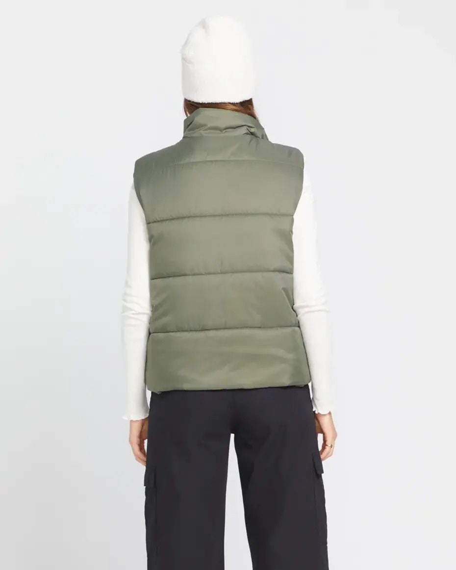 Fabriqué avec une coque en taffetas de duvet doux et une isolation en polyester, ce gilet vert offre une chaleur fiable sans volume. Le col haut, le design matelassé et les poches passepoilées pratiques en font une couche polyvalente pour toute aventure par temps froid. Coque : 100 % taffetas de duvet doux, 35 g/m², Doublure : 100 % tricot brossé en polyester, 210 g/m² Rembourrage : 100 % polyester, isolation roulée, 190 g/m² Gilet zippé sur le devant, col haut avec matelassage Rabat-tempête avec fermeture à pression