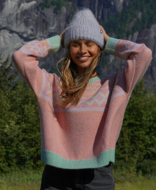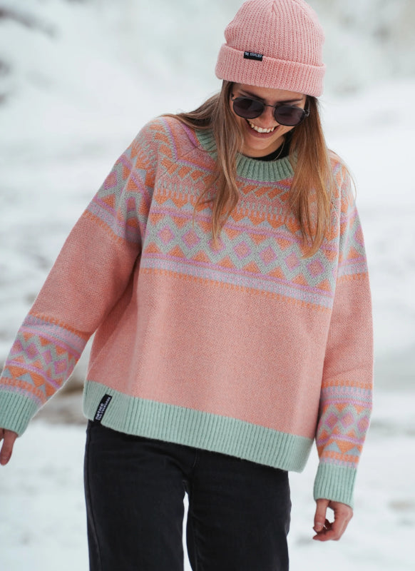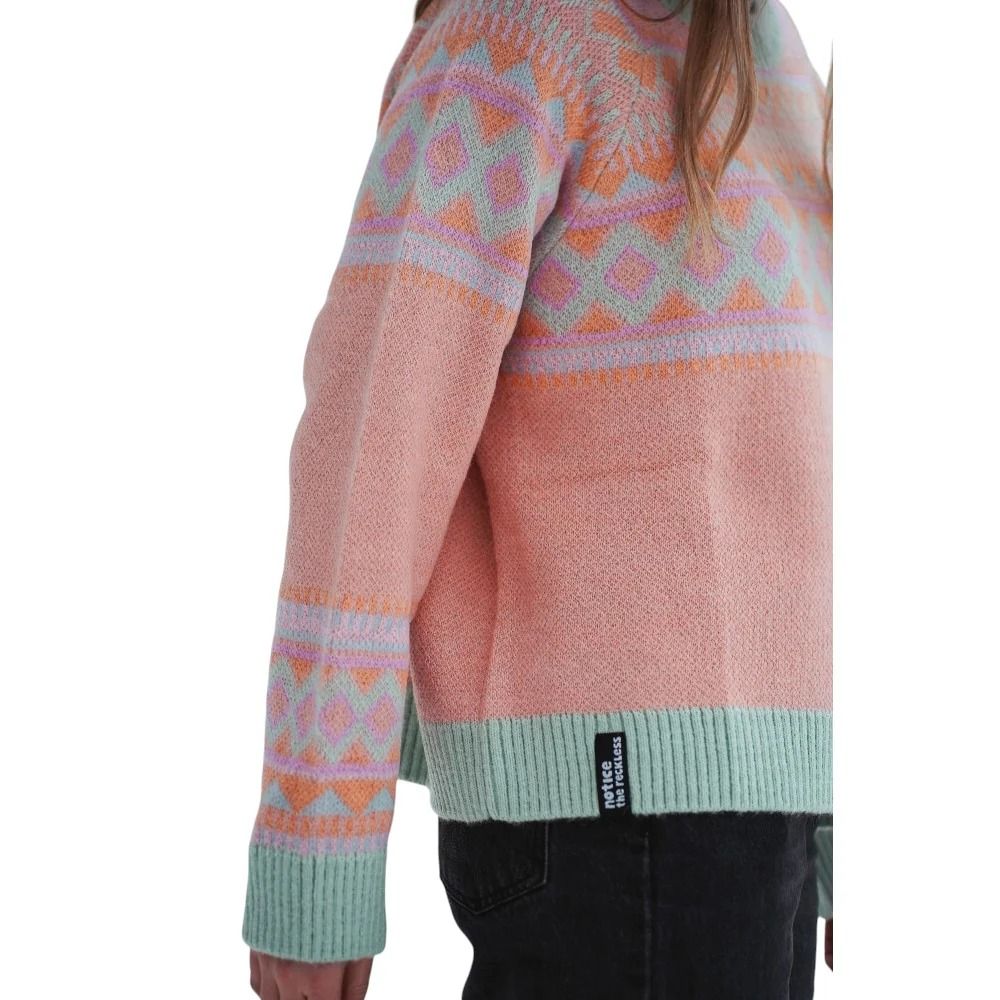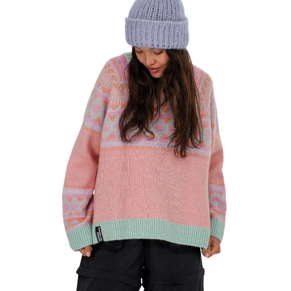 Pull en maille pour femme Caractéristiques : encolure ronde et manches raglan 54 % acrylique, 32 % polyester, 10 % laine, 4 % mohair Rose avec motif dans des tons de sarcelle, saumon et lilas Coupe décontractée