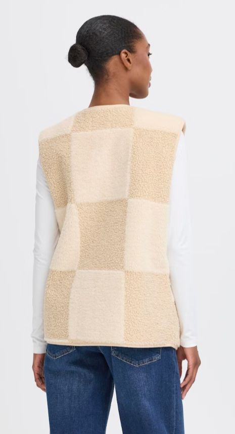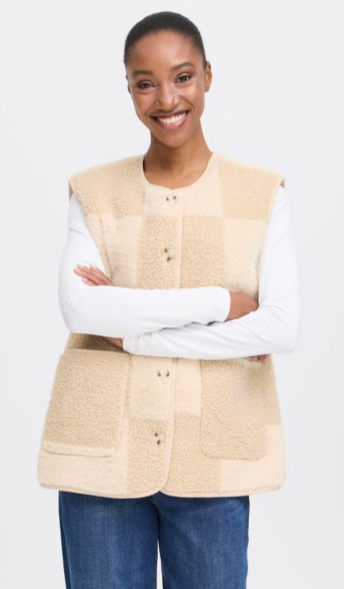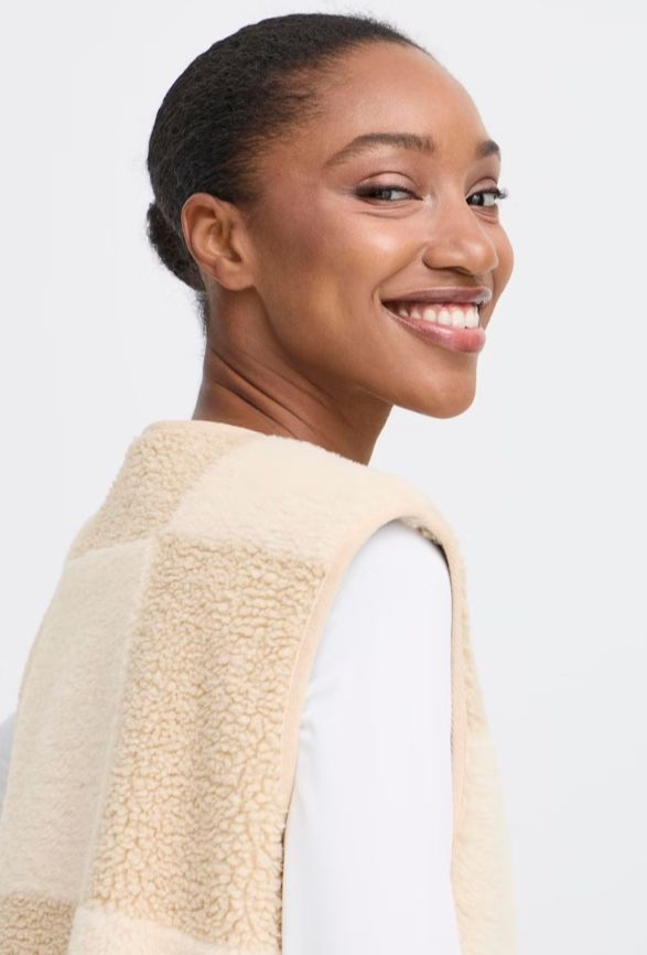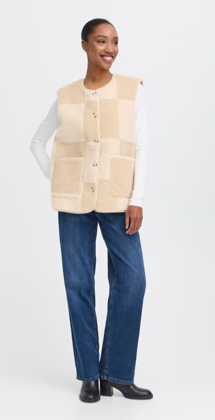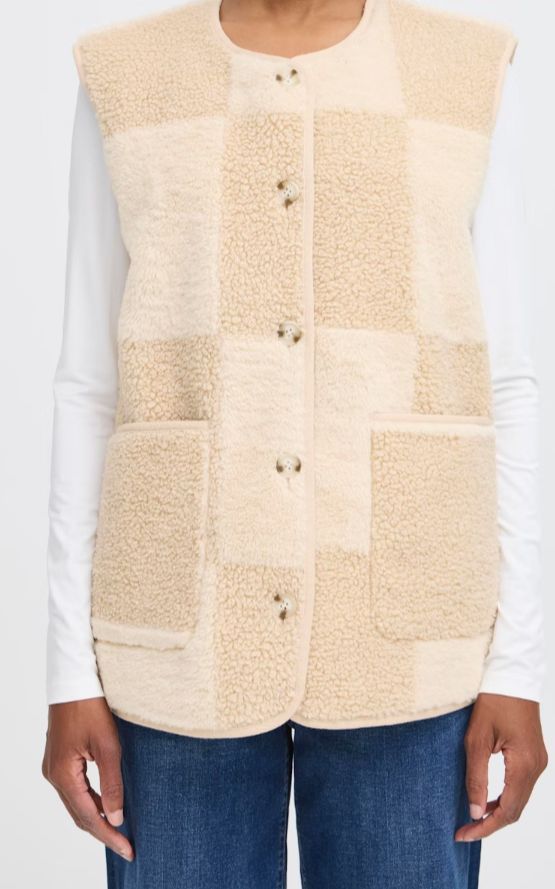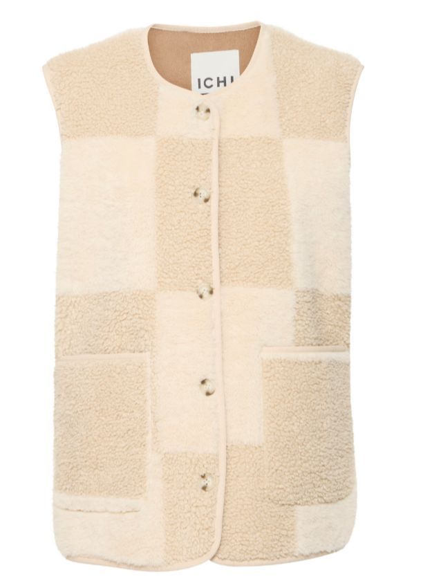 Veste de la compagnie Ichi. Veste sans manche, fausse fourrure. Cette veste est boutonnée et a deux poches plaquées au devant. Cette veste sera un atout dans votre garde-robe pour le changement de saison. Elle ira à merveille sur presque toutes les bases.