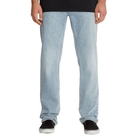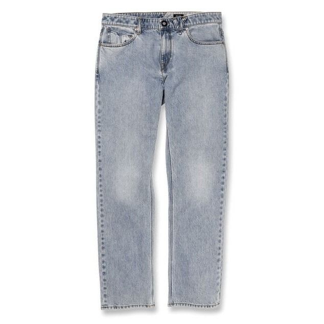 Denim gris indigo fortement délavé avec ponçage important sur les cuisses, les genoux et les poches pour les mains.