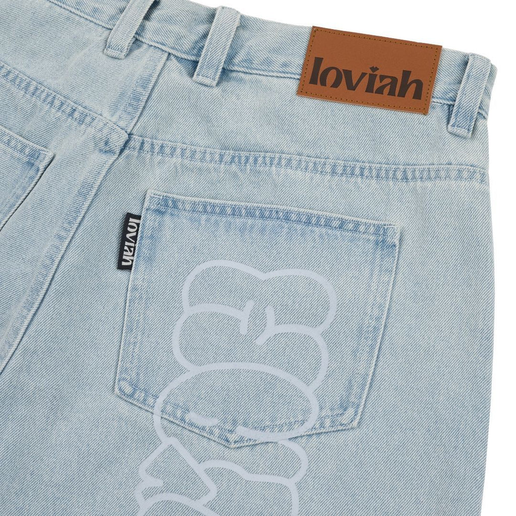 100% coton 5 poches Braguette zippée en métal Bouton gravé Loviah sérigraphié sur la jambe droite Étiquette tissée sur la poche arrière droite Coupe ample