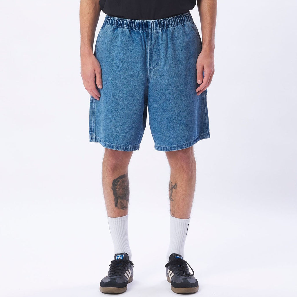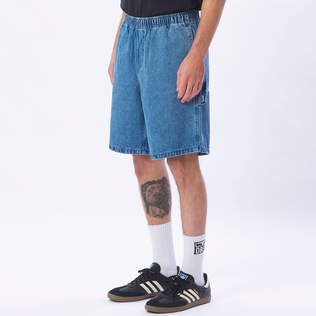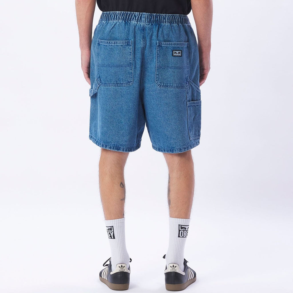 SHORT EN DENIM AVEC TAILLE ÉLASTIQUE STYLE CARPENTER • TAILLE ÉLASTIQUE COMPLÈTE AVEC CORDON DE SERRAGE ARRONDI • FAUSSE FERMETURE • POCHES LATÉRALES SUR LE DEVANT • POCHES STYLE CARPENTER AVEC ATTACHE POUR MARTEAU • ÉTIQUETTE OBEY EYES SUR LA POCHE ARRIÈRE DU CÔTÉ DROIT • 100 % COTON • 13,5 OZ • COUPE DÉCONTRACTÉE • LONGUEUR EXTERNE DE 20