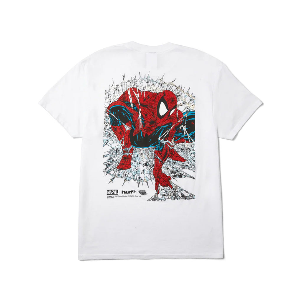 • T-shirt à manches courtes 100 % coton • Imprimé graphique au centre de la poitrine et dans le dos • Détail d'impression holographique sur l'illustration de Spider-Man • Éléments co-marqués HUF x Marvel