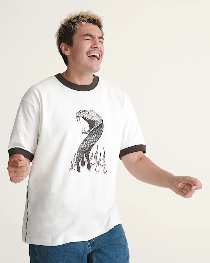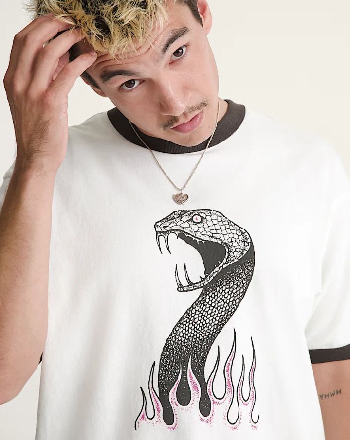 Orné d'une illustration emblématique de l'artiste, designer et skateur Mike Gigliotti, le t-shirt Skate Mike G Snake Flame Ringer revisite un t-shirt classique contrasté avec un imprimé serpent bouffant surgissant des flammes, ses crocs déployés. Des coutures plates contrastées sur les côtés et sous les bras ajoutent des détails visuels intrigants, tandis que sa coupe ample offre une grande liberté de mouvement. T-shirt à manches courtes et col ras du cou Imprimé serpent bouffant sur la poitrine Coutures plates contrastées sur les côtés et sous les bras 5-Détail de broderie en damier Ensemble d'étiquettes co-marquées Vans Skateboarding Coupe ample 100% coton