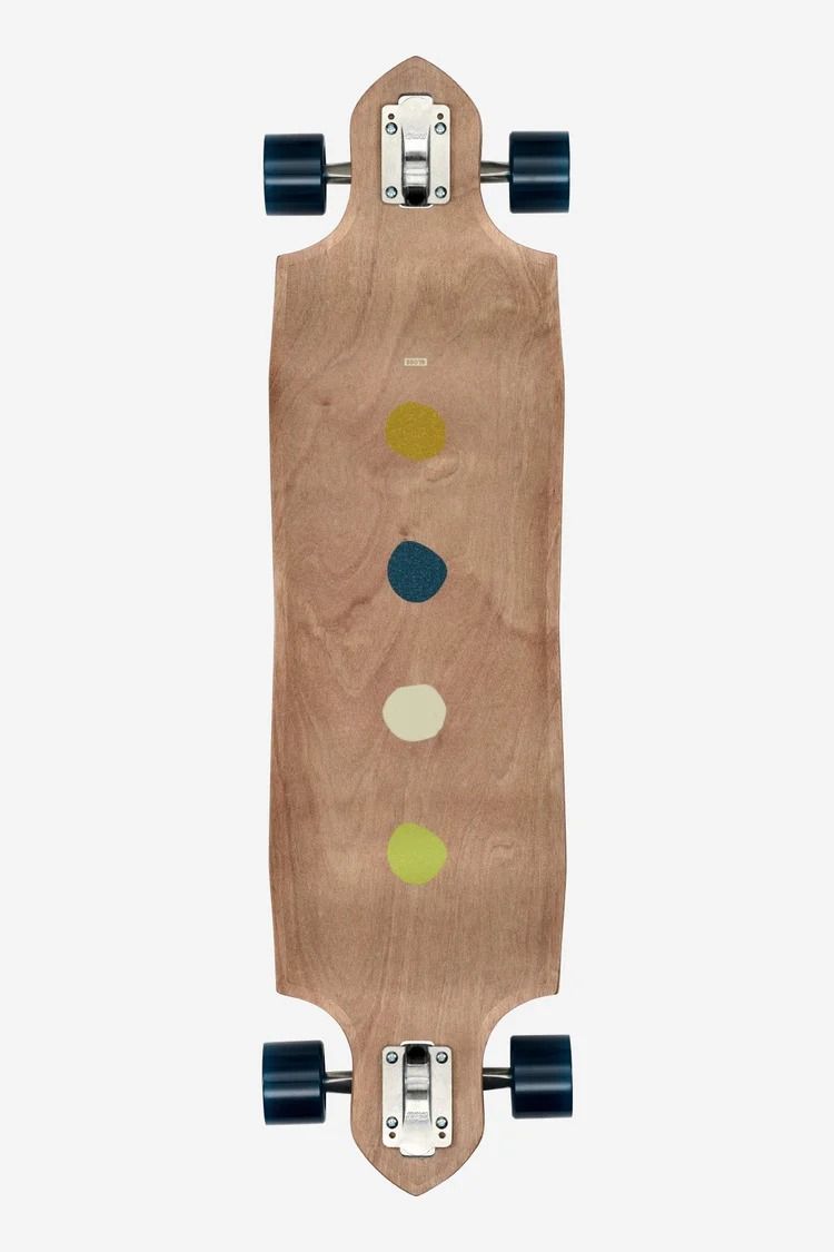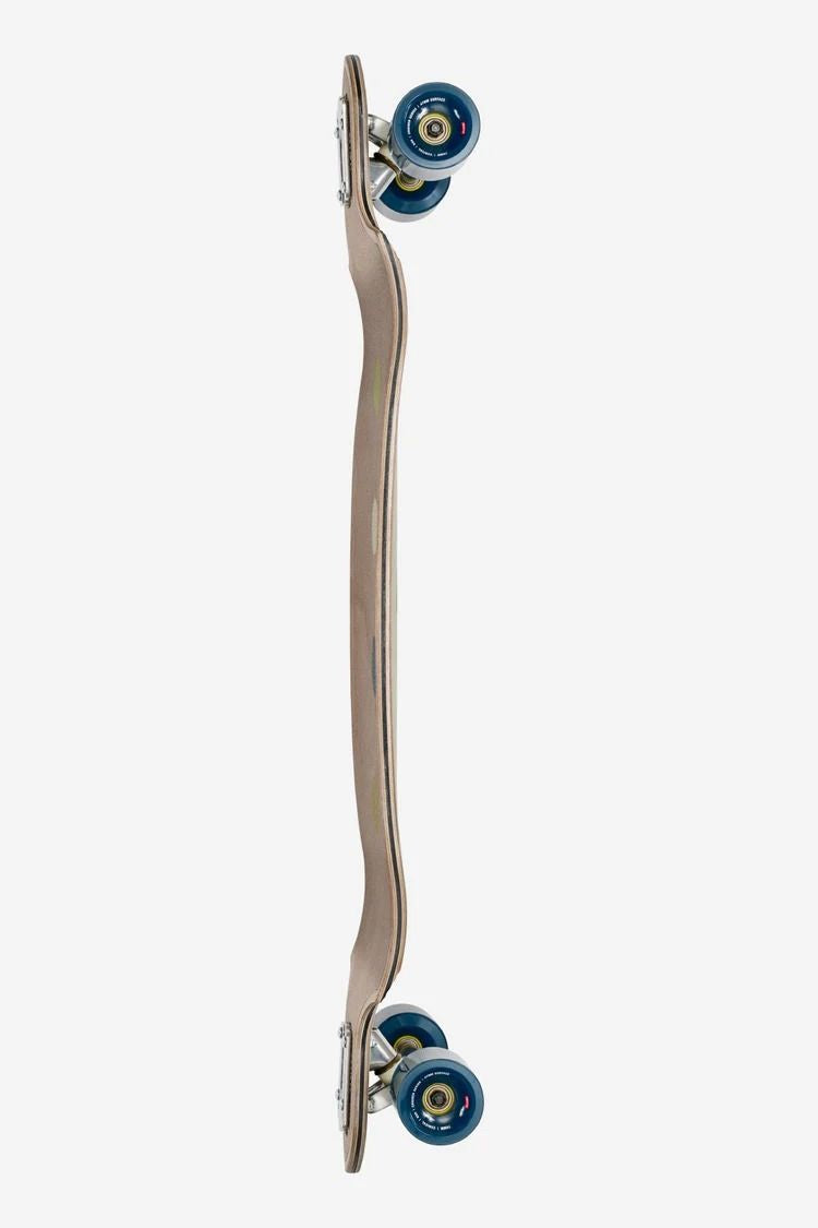 37,5 x 10 x 28,25 wb • Érable dur en résine 8 • Plateforme légèrement abaissée avec un léger concave en W • Trucks Slant Reverse Kingpin de 180 mm • Roues Cruiser coniques 83a de 70 mm • Griptape transparent avec top art