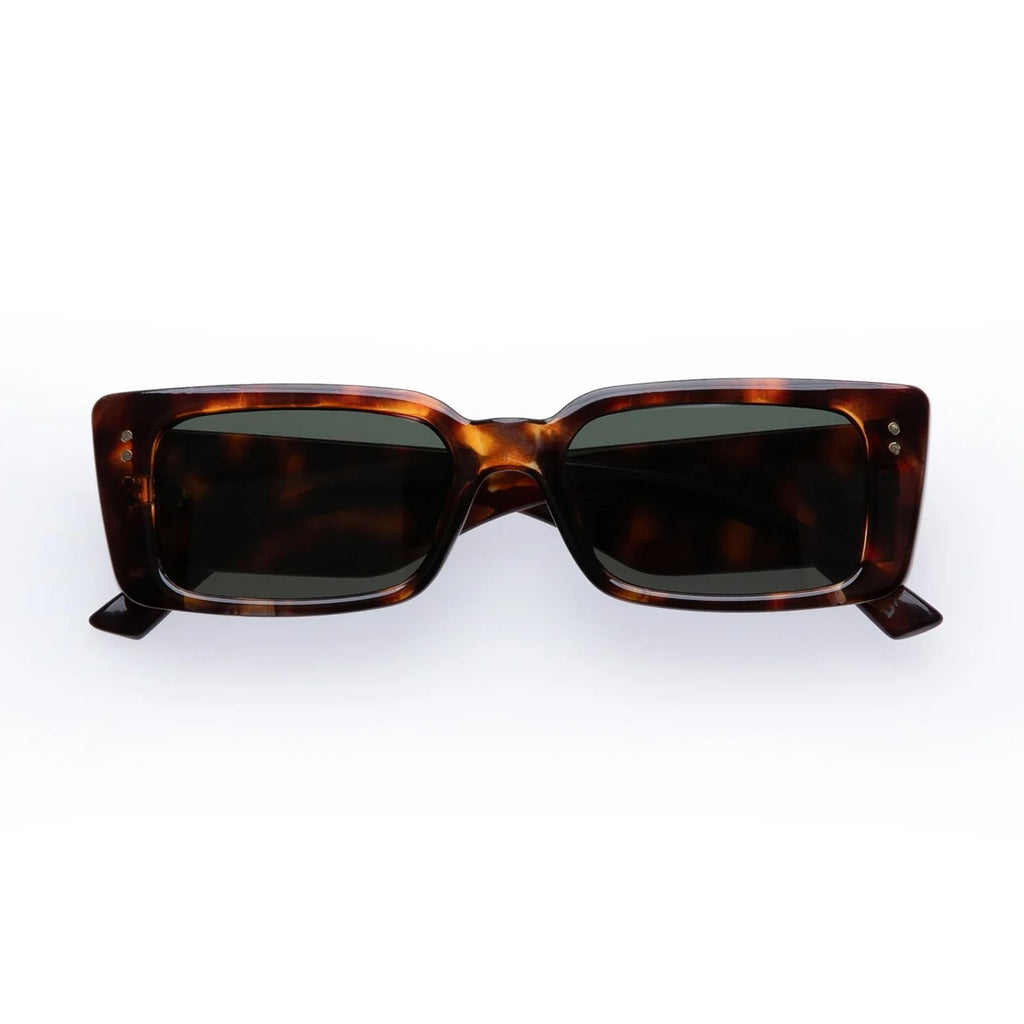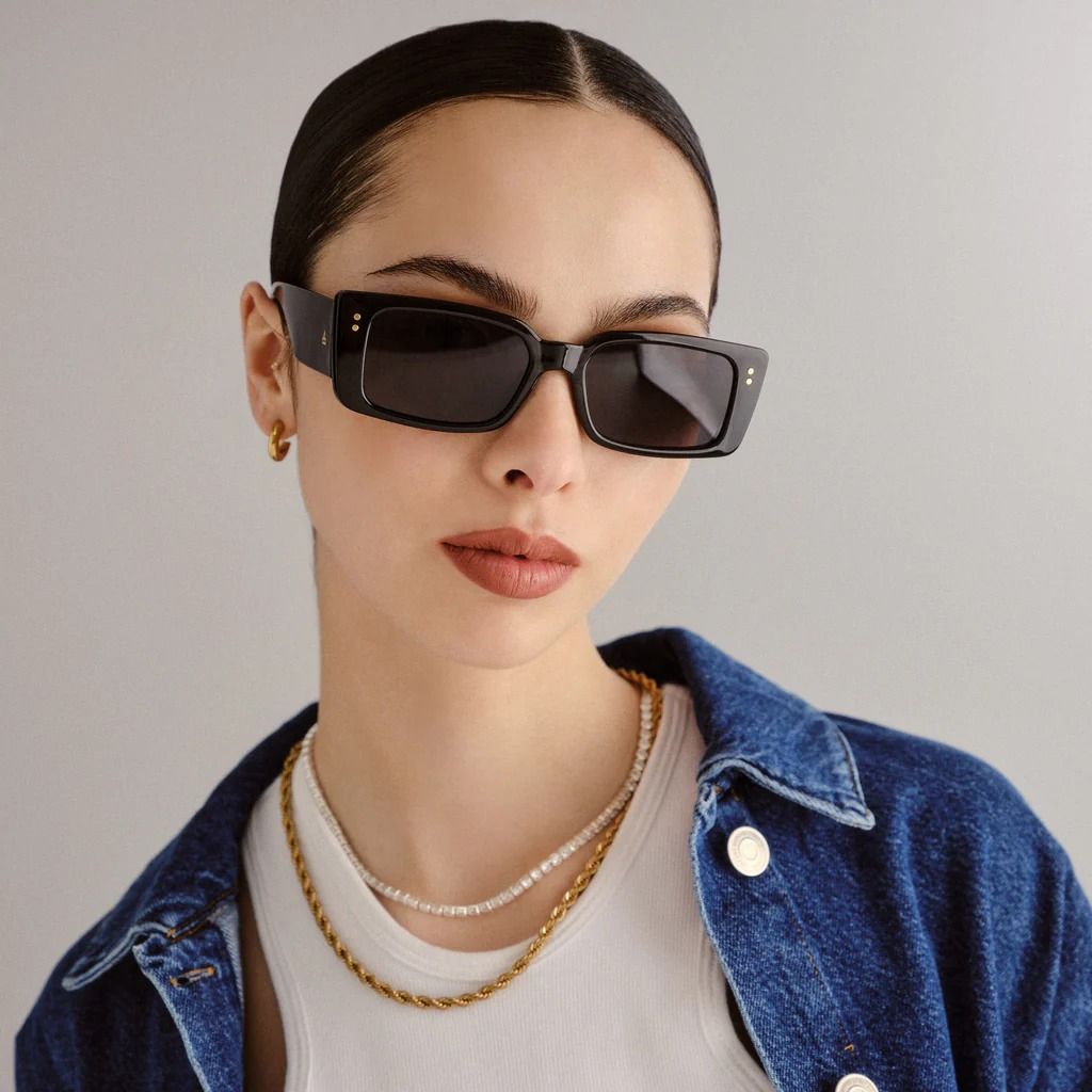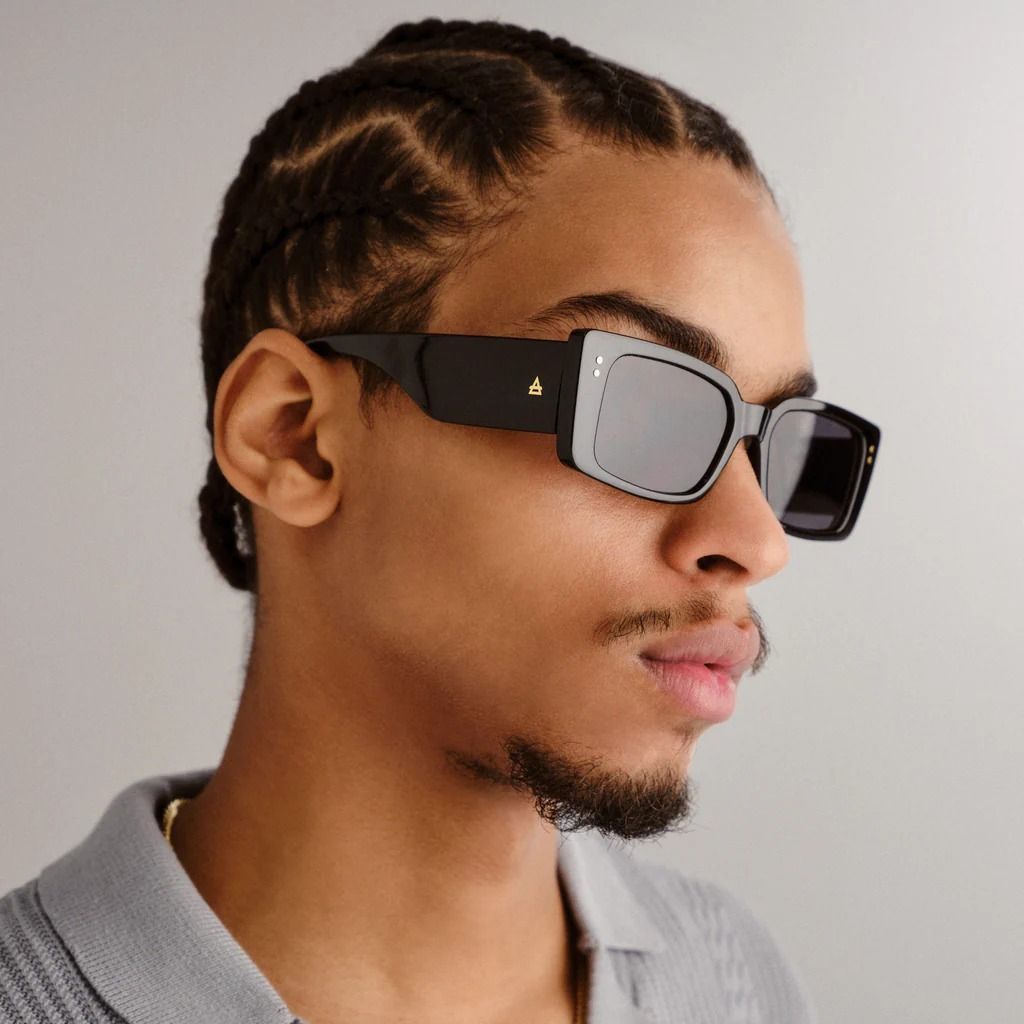 Lunettes de soleil rectangulaires audacieuses avec rivets en métal, Coupe moyenne, Un incontournable unisexe à associer avec n'importe quelle tenue, Monture noire avec verres mono fumés, Logo AIRE en aluminium sur les deux branches, Fabriquées à partir d'un matériau de monture en polycarbonate recyclé certifié 100 % GRS